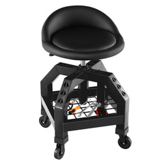 Comfy Seating Experience: Covered with superior PVC leather and padded with high-density sponge, this rolling mechanic seat provides an unparalleled comfort level. In addition, its ergonomic design promotes good seating posture, thus easing the strain of bending and sitting for long periods during repair work.